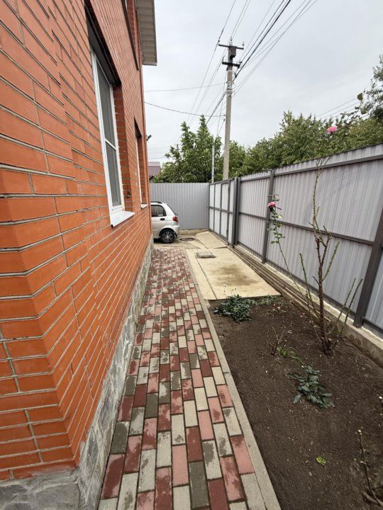 Продается угловой кирпичный дом, 2016 года постройки. Дом построен полностью из кирпича с утеплителем из пенопласта. Зимой - тепло, летом - прохладно. Удобная планировка, 2 этажа: 1 этаж - спальня 20 кв м, кухня-коридор 35 кв м, совмещенный санузел полностью в кафеле, 2 этаж - 2 комнаты (1 изолированная) по 15 кв м, застекленная веранда-прихожая. Удобная бетонная лестница на второй этаж. В 2024 году сделан свежий евро ремонт, везде полы плитка и ламинат, новая мебель во всем доме, при продаже все остается, включая некоторую бытовую технику. Присутствуют придомовой навес с мангальной зоной. Земельный участок 4 сотки, на котором находятся хорошие кирпичные постройки (с ремонтом внутри: кладовая, сарай, вольер), насаждения (виноград, малина, инжир, клубника, клумбы с парковыми розами). Заезд на 2 машины, подъезд к дому хороший, широкая улица, забор высокий металлопрофиль с откатными воротами. |