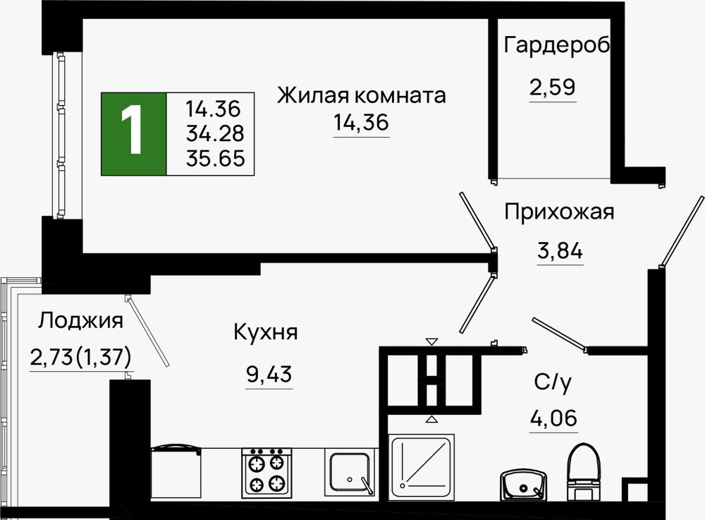 Площадь (кв.м.) | Общая: 35.65 Жилая: 14.36 Кухня: 9.5 35.65 / 14.36 / 9.5 |